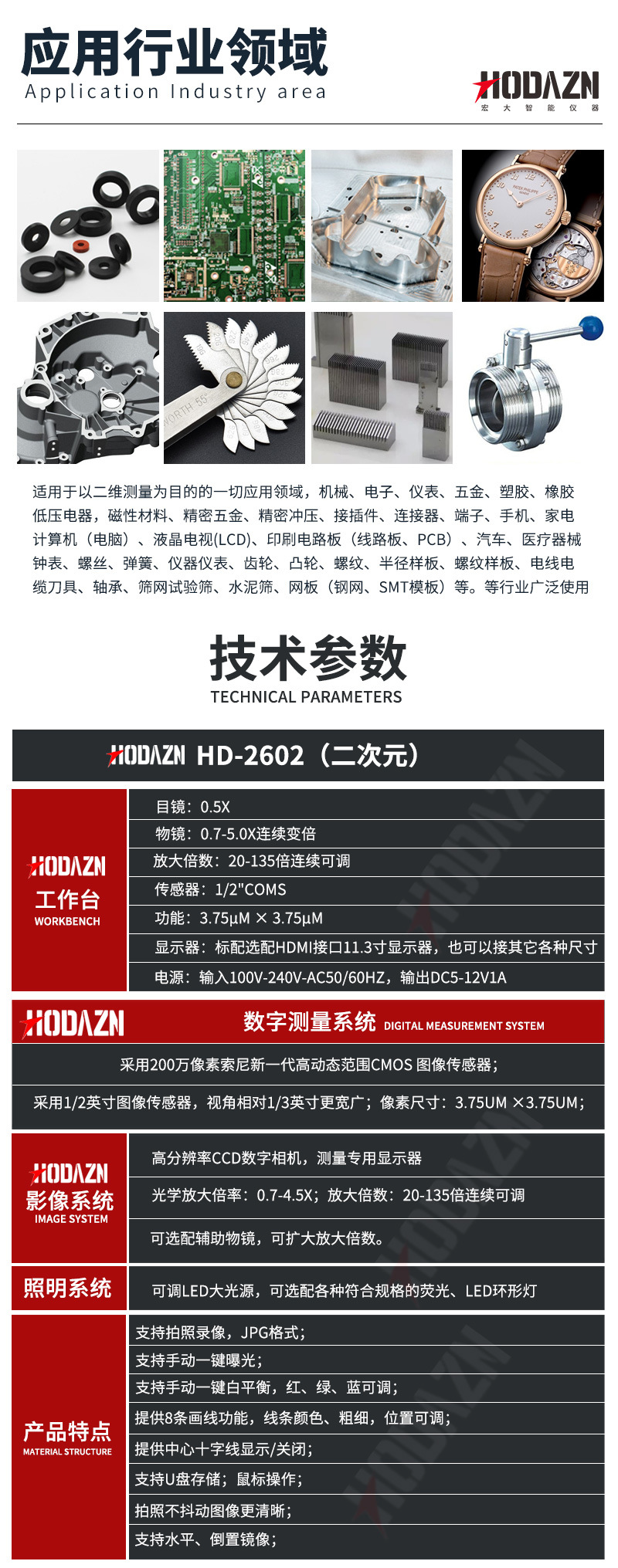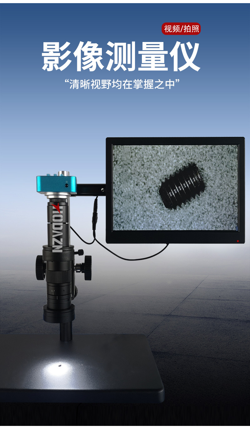 HD-2602(HOD-2602)工業(yè)顯微鏡也叫視頻顯微鏡,本機(jī)采用200萬像素索尼新一代高動態(tài)范圍CMOS 圖像傳感器,HDMI 1080P 60幀圖像輸出,支持拍照錄像,JPG格式,手動一鍵曝光,一鍵白平衡,紅、綠、藍(lán)可調(diào),支持水平、倒置鏡像。