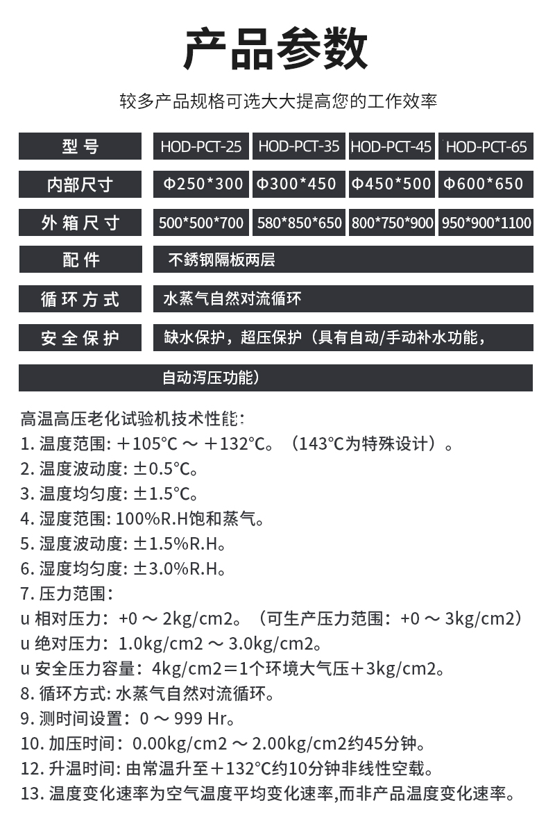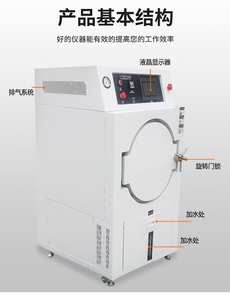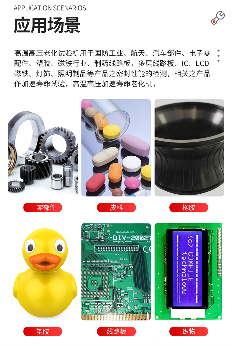 HD-PCT(HOD-PCT)設(shè)備適用于國防、航天、汽車部件、電子零配件、塑膠、磁鐵行業(yè)、制藥線路板,多層線路板、IC、LCD、磁鐵、燈飾、照明制品等產(chǎn)品之密封性能的檢測,相關(guān)之產(chǎn)品作加速壽命試驗,使用于在產(chǎn)品的設(shè)計階段,用于快速暴露產(chǎn)品的缺陷和薄弱環(huán)節(jié)。